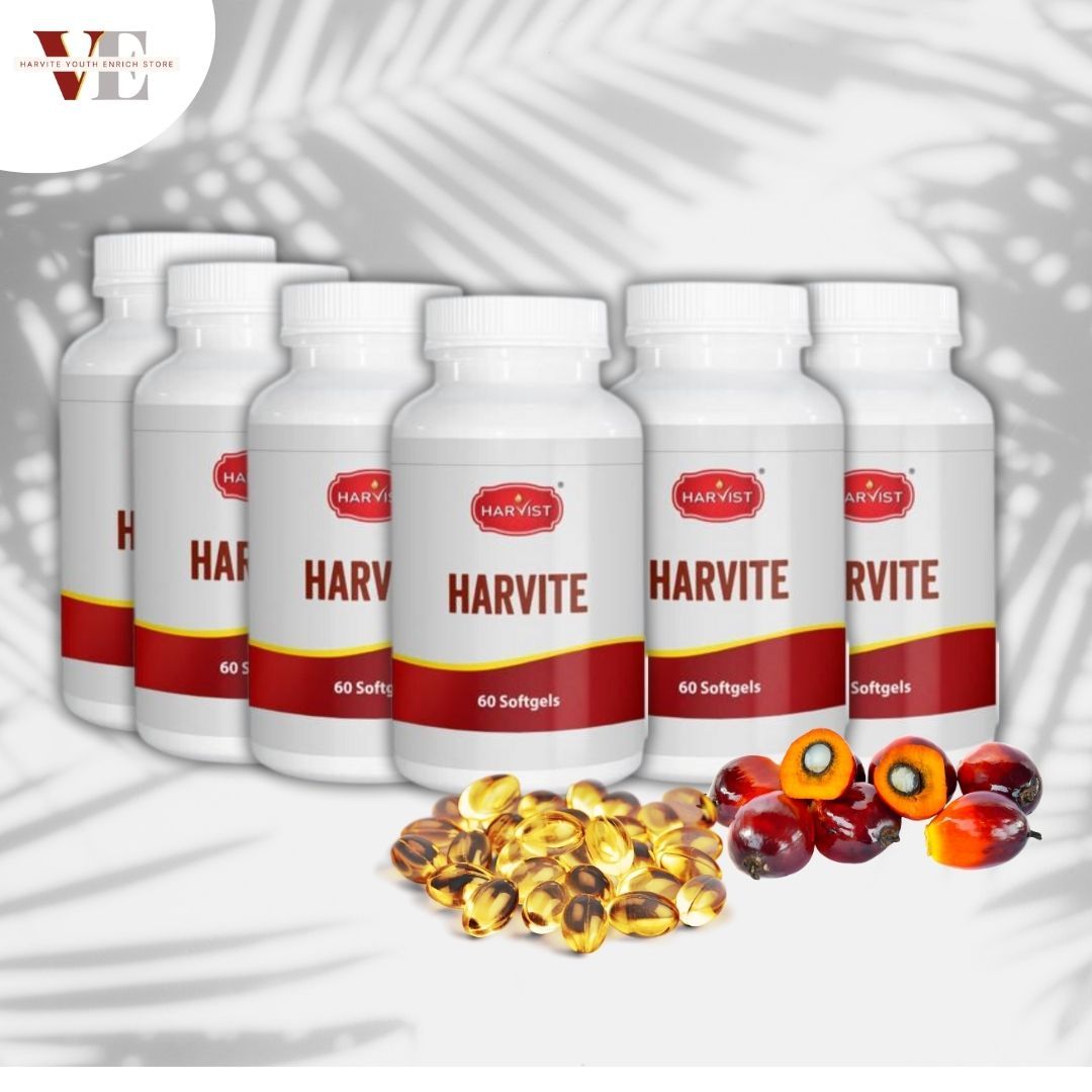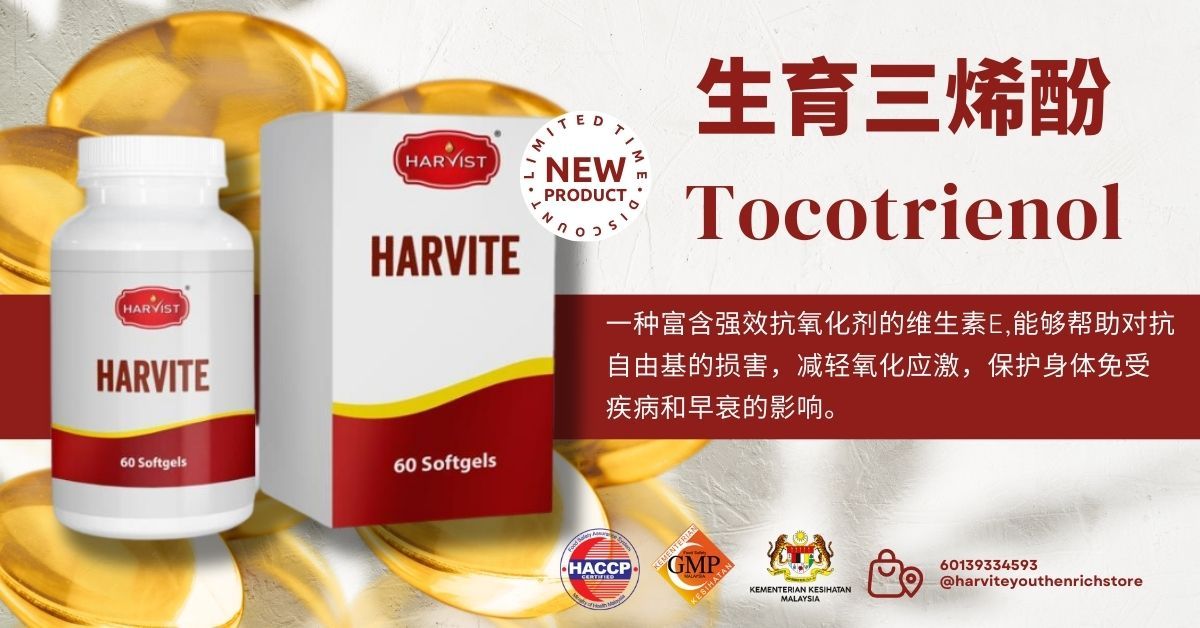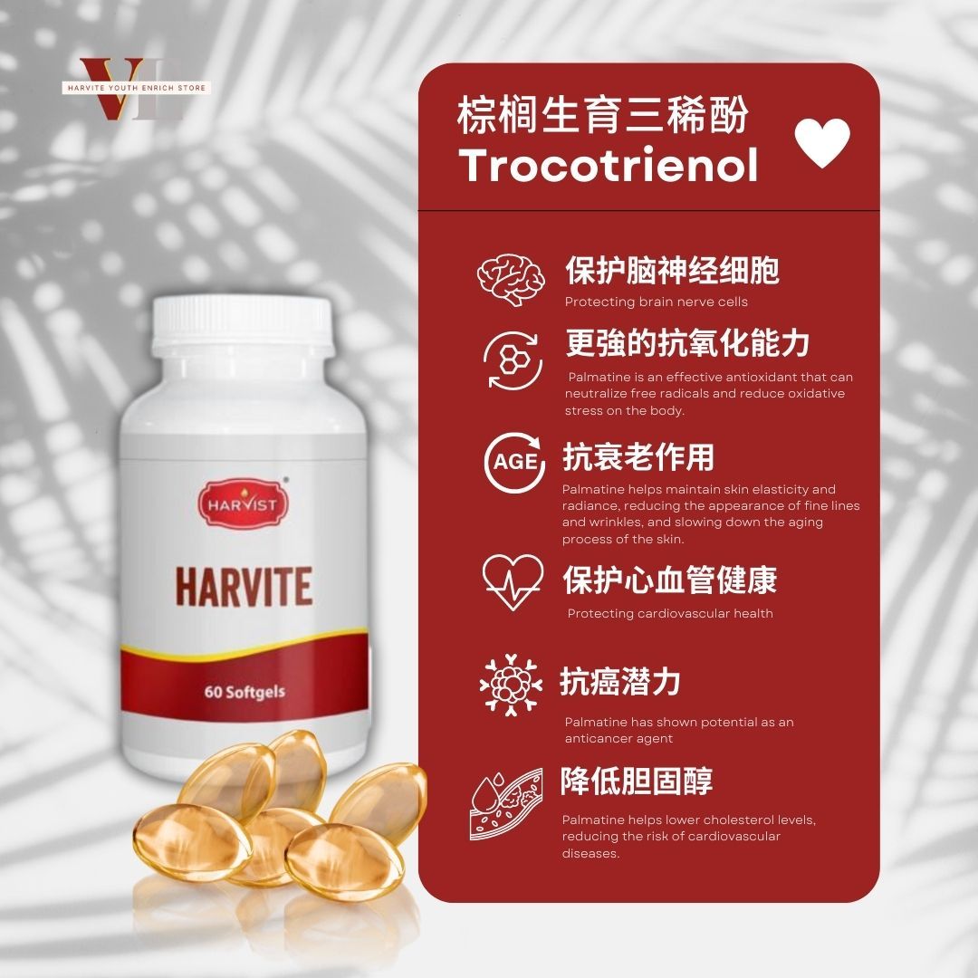 HARVITE TOCOTRIENOLS 解决了导致皮肤衰老的种种问题。其活性成分棕榈生育三稀酚 (Mixed Palm Tocotrienols) 已被证实能促进身体制造更多的胶原蛋白,其功效比普通的维生素E高出140%,让肌肤保持水润,紧实及有弹性。
